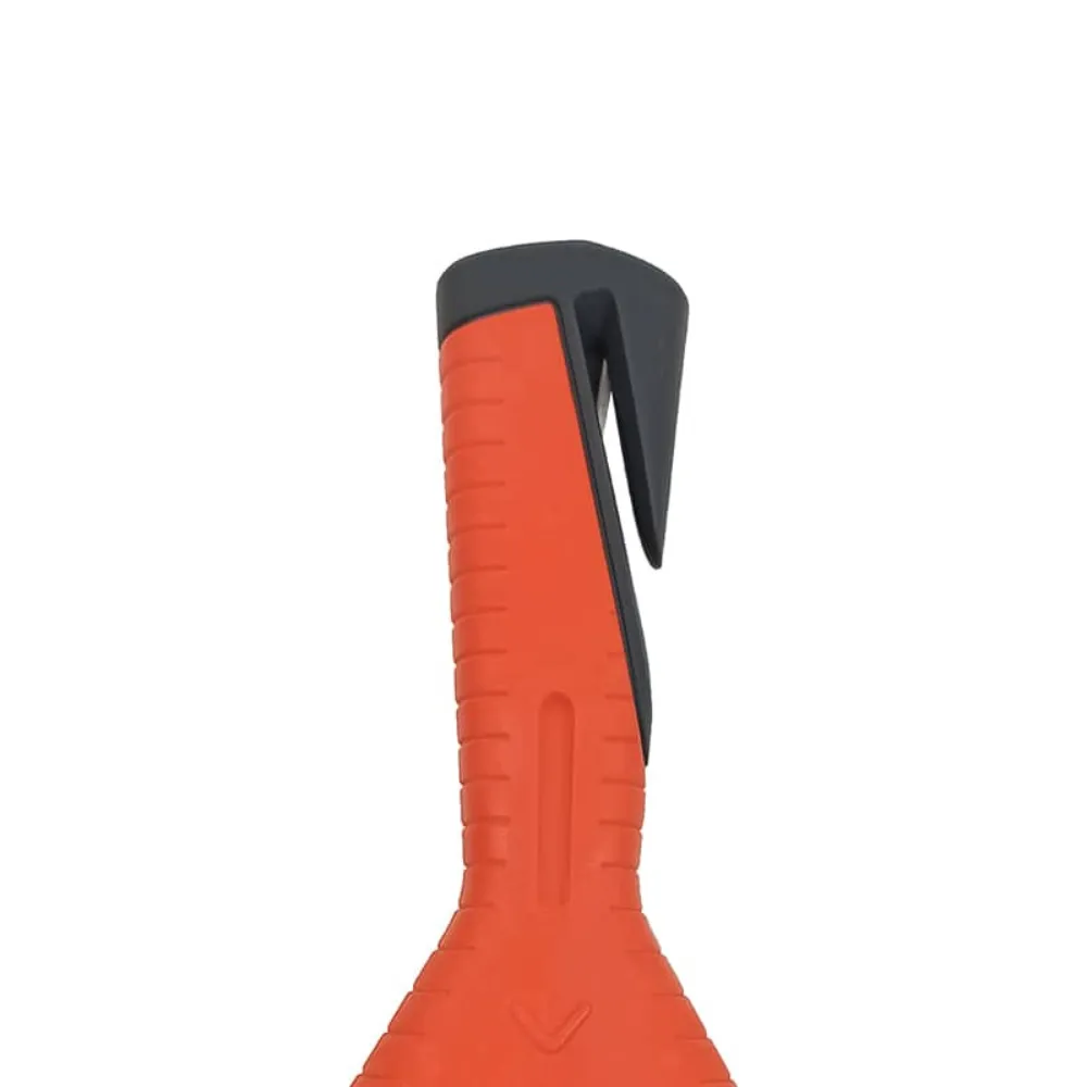در انتهای دسته، یک تیغهی بسیار تیز و برنده تعبیه شده است. این تیغه با یک لایه محافظ پلاستیکی پوشانده شده تا از آسیب دیدن دست جلوگیری کند، اما به راحتی میتواند ضخیمترین کمربندهای ایمنی را در یک ثانیه برش دهد.